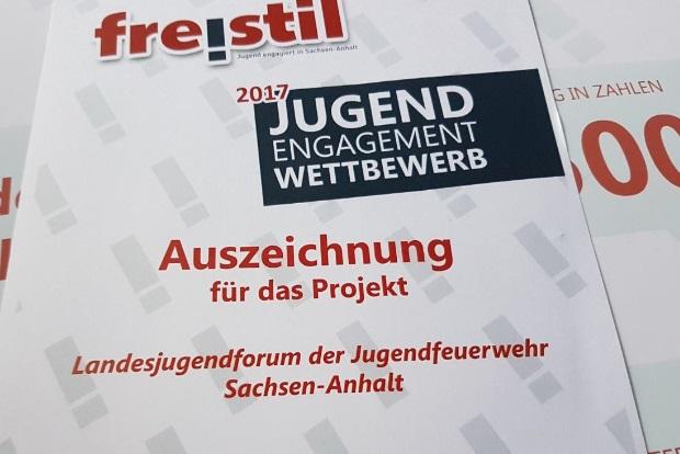 Mit großer Freude konnte das Landesjugendforum, vertreten durch Thomas Bläsing, am 20. Mai 2017 unter 50 Bewerbern den Hauptpreis beim diesjährigen Jugendengagementwettbewerb in Halle entgegennehmen.