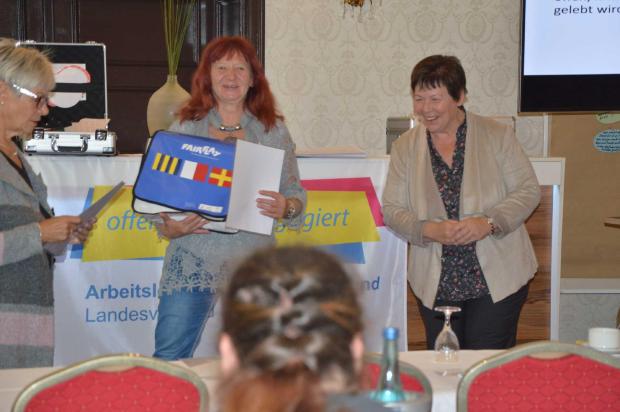 Am Donnerstag folgte der 14. Landesverbandstag, der zunächst mit Diskussionsergebnissen von den Thementischen zu „Lebenswürdiger Existenzsicherung“, „Der ALV als Dienstleister 4.0“, „Die Zukunft des ehrenamtlichen Engagements“ und „Das Fairplay-Projekt“ startete. In diesem Rahmen fand auch die Zertifikatsübergabe für die erfolgreichen Teilnehmenden der Fairplay-Weiterbildung dieses Jahres statt. Grußworte des Chefs der Staatskanzlei des Landes Brandenburg, Herr Martin Gorholt, der Bürgermeisterin der Stadt Strausberg, Frau Elke Stadeler, und Herrn Andreas Kaczynski, Vorstandsvorsitzenden des Paritätischen LV Brandenburge.V. folgten, bevor die Verbandsmitglieder und der Vorstand in die Arbeit des Tages einstiegen. Nicht nur Berichte aus der Verbandsarbeit und der Haushaltssituation der letzten vier Jahre folgten, auch wurden mehrere Mitarbeiterinnen für ihr langjähriges und großes Engagement im ALV geehrt.