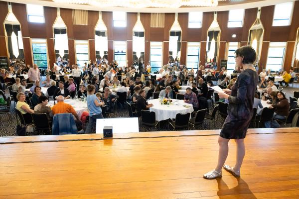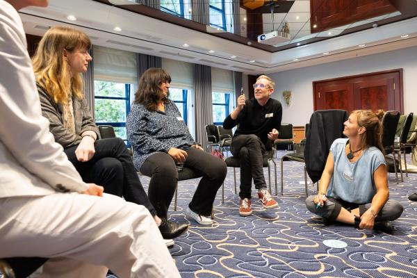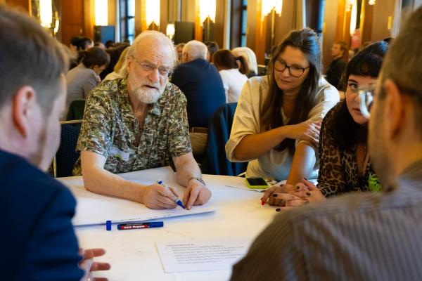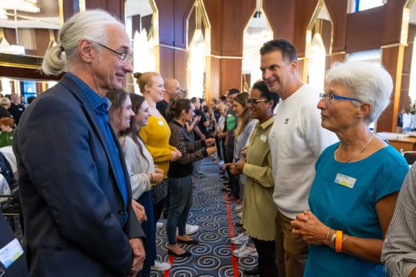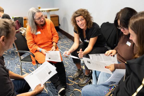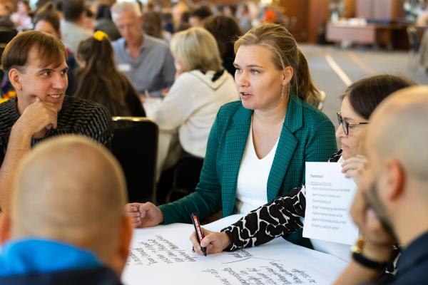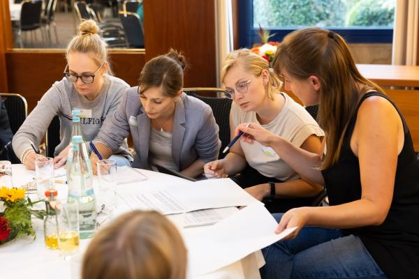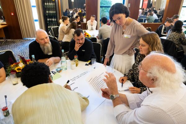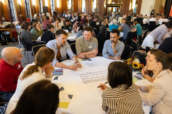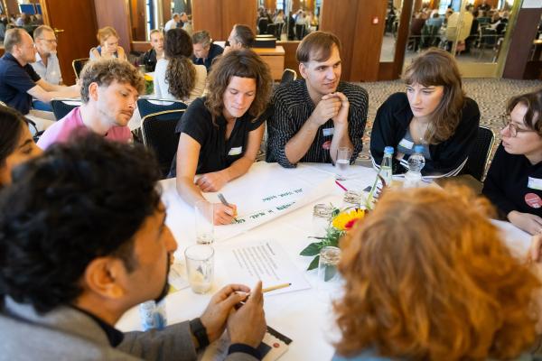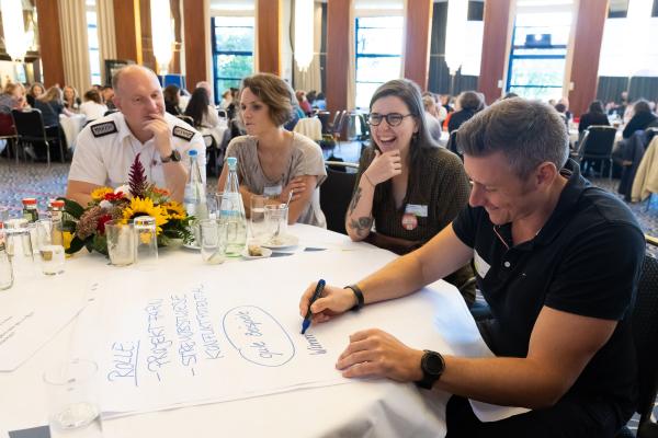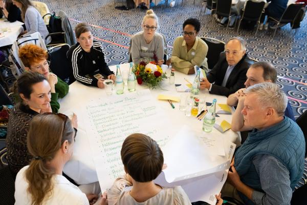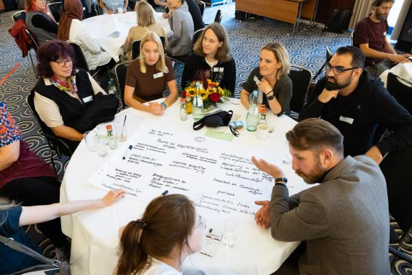 Zugeschnitten auf die Teilnehmenden und Vertreter/-innen der verschiedenen Projekte des Bundesprogramms „Zusammenhalt durch Teilhabe“ (Z:T) hat sich die Jahrestagung als fester Bestandteil für Input, Austausch, Vernetzung und Wissenstransfer etabliert. Unter dem diesjährigen Tagungsmotto „Klimaaktiv für gesellschaftlichen Zusammenhalt“ haben wir den Schwerpunkt auf die Auseinandersetzung mit Klimaschutz gelegt; hier wurden insbesondere die positiven und bestärkenden Potenziale einer gesellschaftlichen Transformation den Fokus gerückt. Eröffnet wurde die Tagung mit einem World Café, das den Teilnehmenden die Möglichkeit gab, Wissen und Expertise einzubringen und sich aktiv mit den Fragestellungen auseinanderzusetzen. Leitfragen waren: Welche Rolle können Vereine und Verbände beim Klimaschutz übernehmen? Wie kann der gesellschaftliche Wandel mit demokratiestärkenden Projekten gut begleitet werden? Welche Antworten können auf die gesellschaftliche Polarisierung um Klimagerechtigkeit gefunden werden?
