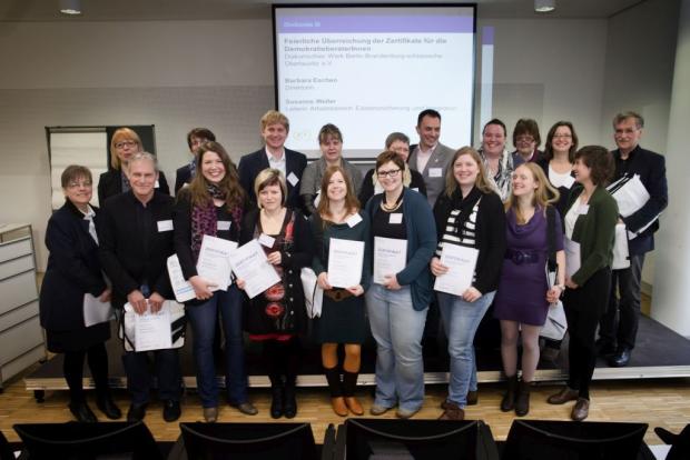 Diese Berater hatten sich in den vergangenen beiden Jahren im Projekt „Demokratie gewinnt! In Brandenburg!“ zu Multiplikatoren ausbilden lassen, die nun vor Ort in ihren Einrichtungen und Diensten Ansprechpartner zu den Themen Diskriminierung und Fremdenfeindlichkeit sind und demokratisches Miteinander vor Ort stärken. Inhalt der Ausbildung war neben dem Umgang mit Diskriminierung, Rassismus und Rechtsextremismus, die eigenen Kommunikations-und Konfliktlösungsfähigkeiten zu stärken und auf das Arbeitsfeld bezogene Handlungsmöglichkeiten zu entwickeln.