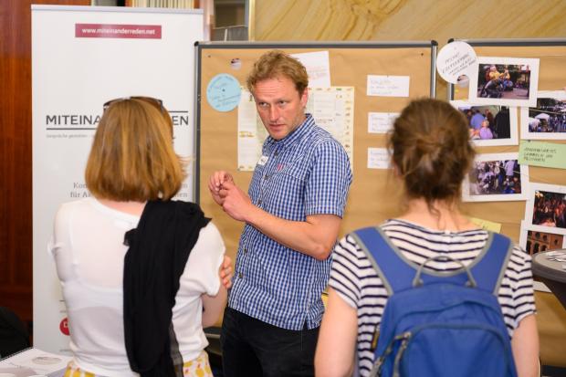 Beim Marktplatz von NAH DRAN war MITEINANDER REDEN mit zwei Projekten vertreten, die ihre jeweiligen spezifischen Interaktionsmethoden und Kommunikationsansätze im Gespräch vorgestellt haben: Die Gemeinde Beverstedt (Landkreis Cuxhaven) setzt sich mit ihrem Projekt „Biberbrunnen - worüber wir nicht gesprochen haben“ für die Aufarbeitung des „braunen Kapitels“ des Ortes, der vor 20 Jahren durch rechte Gewalt in die Schlagzeilen geriet, ein. Die anonymen Diskussionen der Bürger/-innen Beverstedts in einem