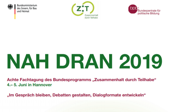 Die achte NAH DRAN Fachtagung des Bundesprogramms "Zusammenhalt durch Teilhabe" fand vom 04. bis 05. Juni 2019 in Hannover statt. Dokumentation der Fachtagung 2019